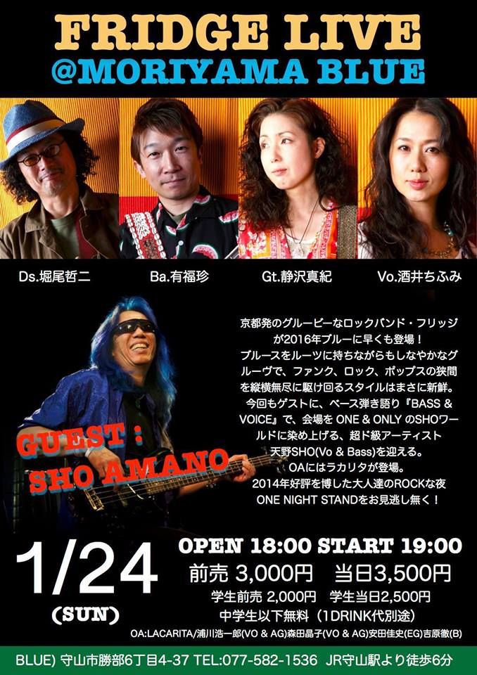 残念なお知らせですが、1月24日日曜日、守山ブルーにて開催を予定しておりました『FRIDGE meets SHO AMANO』ですが、大雪等、悪天候による交通の乱れも予想される為、大事をとり、後日延期とさせていただきます。心待ちにして頂いたお客様には大変申し訳ございませんが、何卒ご理解・ご了承頂きますようよろしく願い申しあげます。なお、振替公演日程につきましては、後日決まり次第、お知らせいたします。