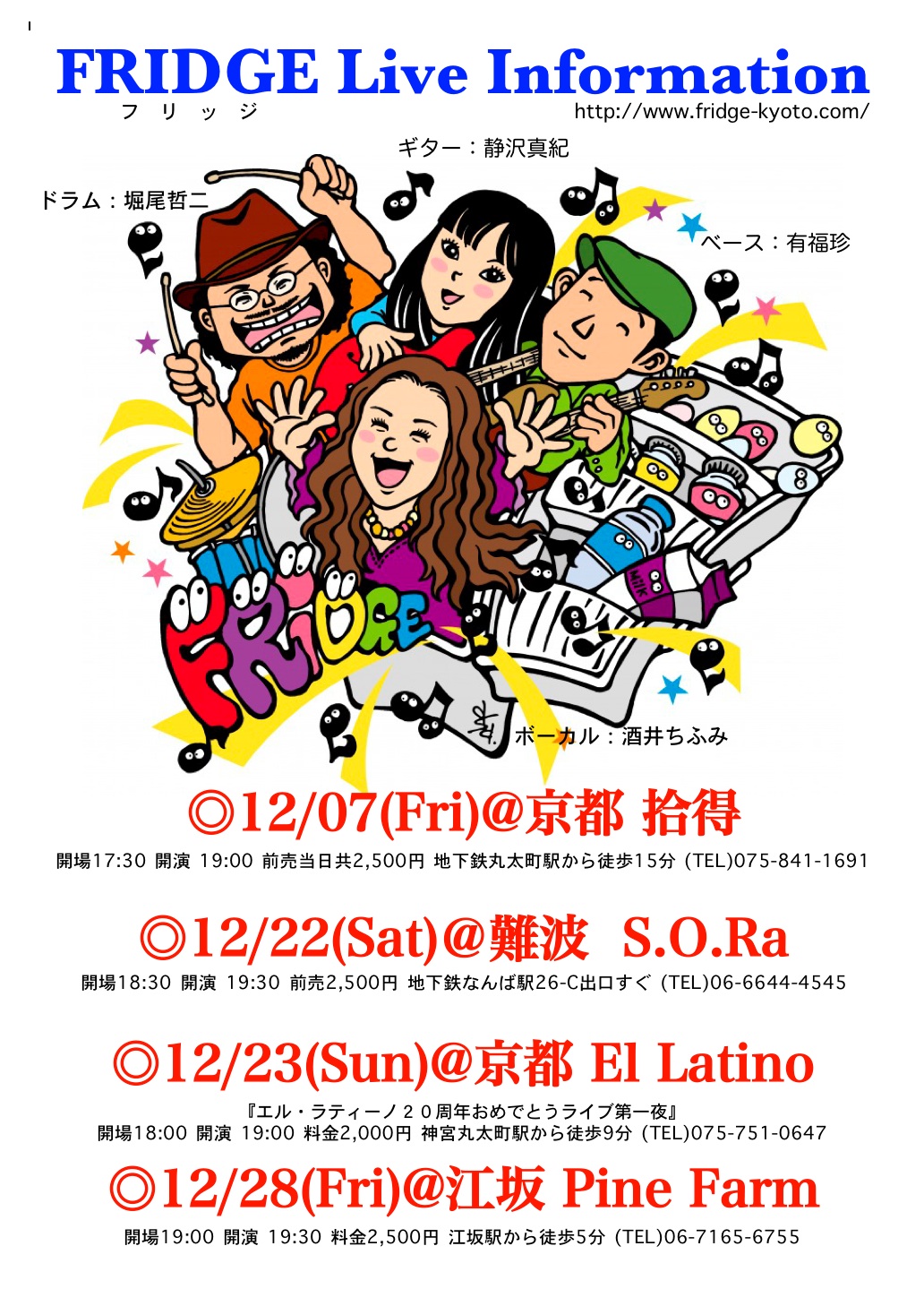 フリッジの年内スケジュール、ポスターでどうぞ!!今年最後の拾得ワンマン、皆さんのお越しをお待ち申し上げておりま〜〜す☆
