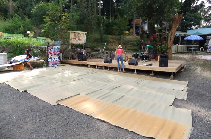 この木製のステージは、長助さんの手作り。ござをひき、スピーカーを運び込みます。