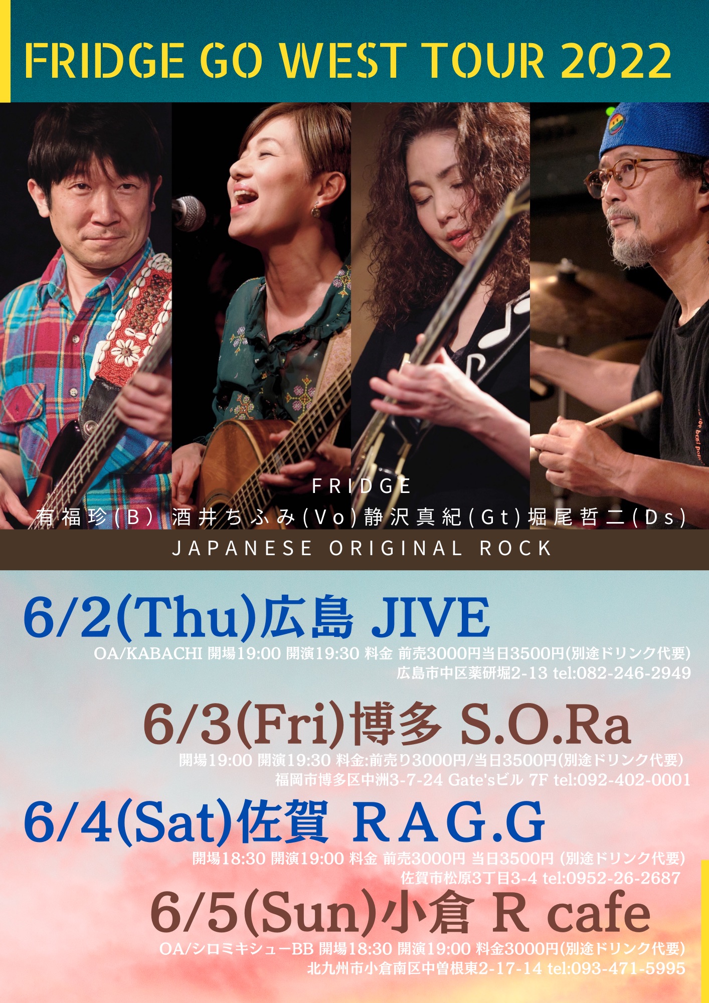 6月初旬にFRIDGE、広島、九州ツアー決定しました!6/2(木)広島JIVE、6/3(金)博多 S.O.Ra、6/4(土)佐賀 RAG.G、6/5(日)小倉 アールカフェと回ります。