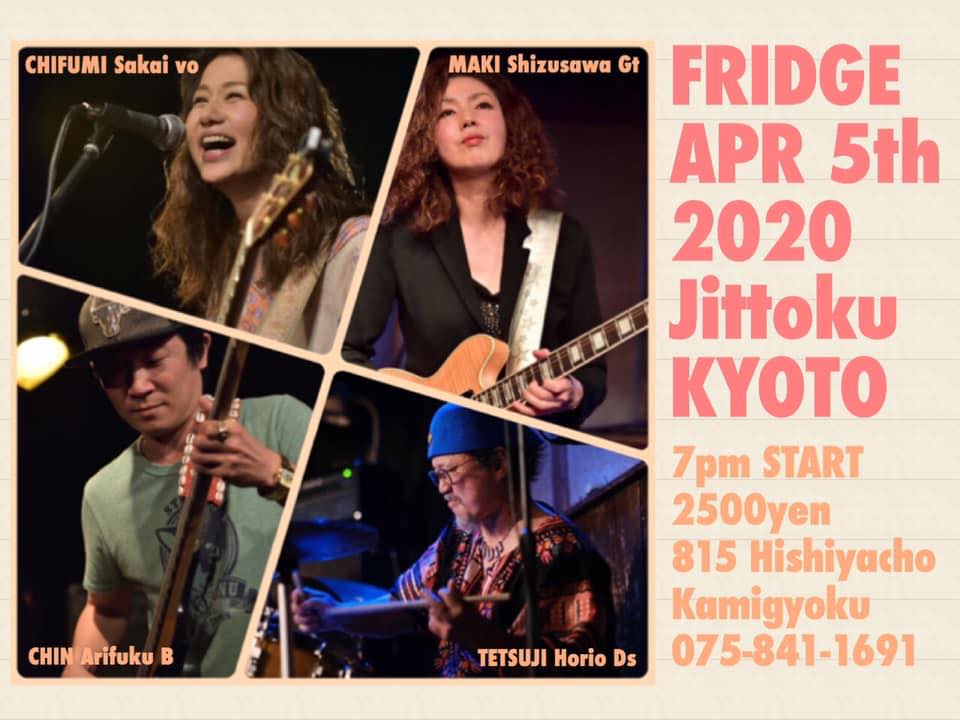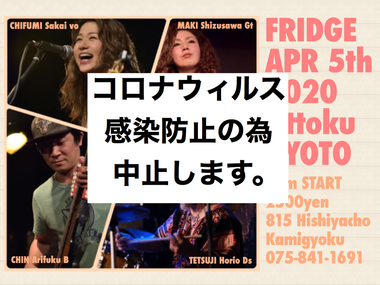 たいへん残念ですが、メンバー全員で話し合った結果、4/5(日)京都拾得でのFRIDGEワンマンライブを中止することにしました。
