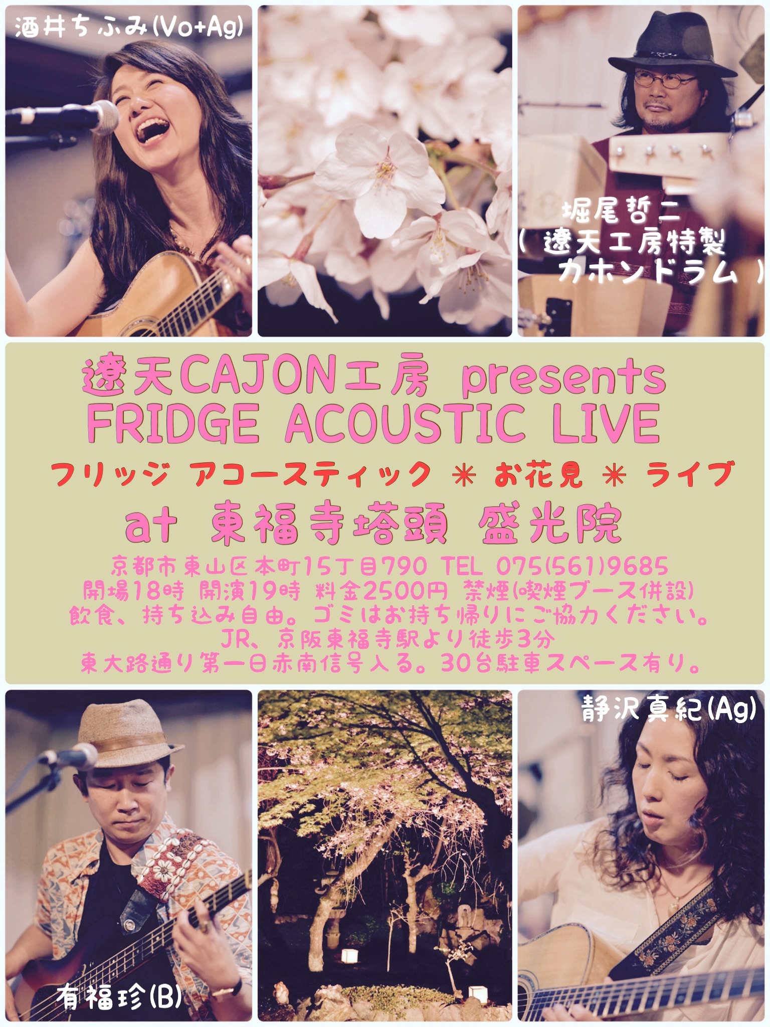 4月1日は、フリッジがお寺でライブです。お庭には夜桜と行燈。音楽は、遼天CAJON工房特製、日本でたったひとつのカホンドラムを大フィーチャーして、いつもよりアコースティックなフリッジ。お飲み物、食べ物、ぜ〜んぶ持ち込みOK!レッツ花見な夜でございます。見逃す手はございません!!エイプリルフールですが、フリッジ嘘つかな〜い✋