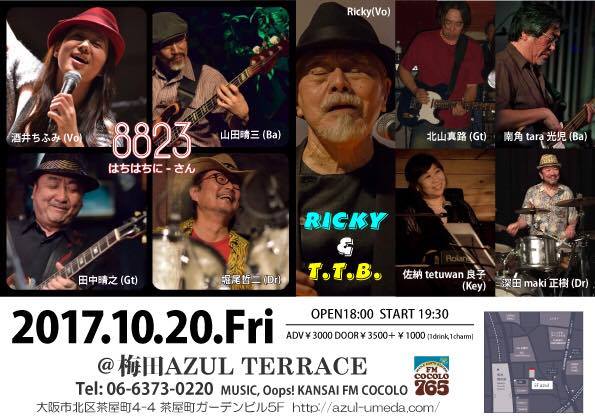 なんとR&BのレジェンドRICKYさん率いるRICKY & T.T.Bと、8823の競演ライブが決定しました。会場は梅田からアクセスの良いAzuleです。ブラックミュージック好きの方に、ぜひとも集まっていただきたいライブです!!